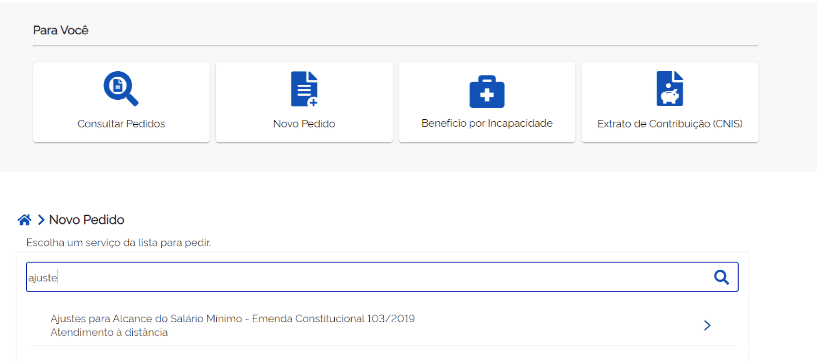 2 – Localizar e clicar em: Novo Pedido/Ajustes para Alcance do Salário Mínimo – Emenda Constitucional 103/2019;