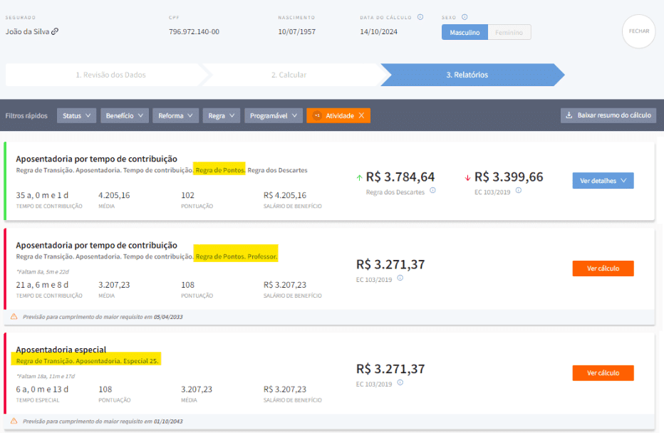 Assim, com apenas alguns cliques você terá em sua tela os resultados para TODOS os regramentos de aposentadoria, inclusive as Regras de Pontos aqui mencionadas.