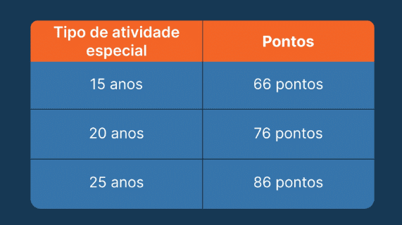 - Pontuação de 66 pontos para a atividade especial de 15 anos;