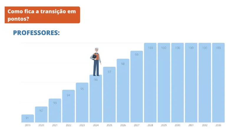 A partir da entrada em vigor da Reforma, passou a exigir também, além do tempo mínimo de magistério, a somatória dos pontos, que, como já citado anteriormente, corresponde à idade + tempo de contribuição do trabalhador.
