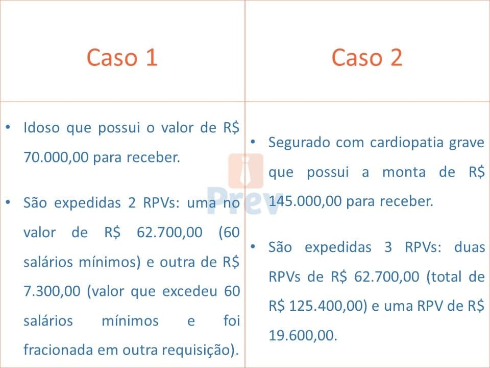 Na hipótese do valor superar 60 salários mínimos, é realizado um fracionamento destes valores e expedida mais de uma RPV, até o limite de três. O que exceder 180 salários mínimos é pago via precatório.