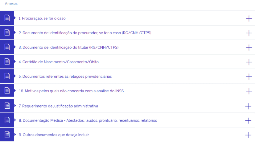 Caso a quantidade de caracteres não seja suficiente, ou, caso prefira, você poderá apresentar suas razões recursais juntando uma petição, em .pdf, clicando em “ + ” no anexo 6. “Motivos pelos quais não concorda com a análise do INSS”;