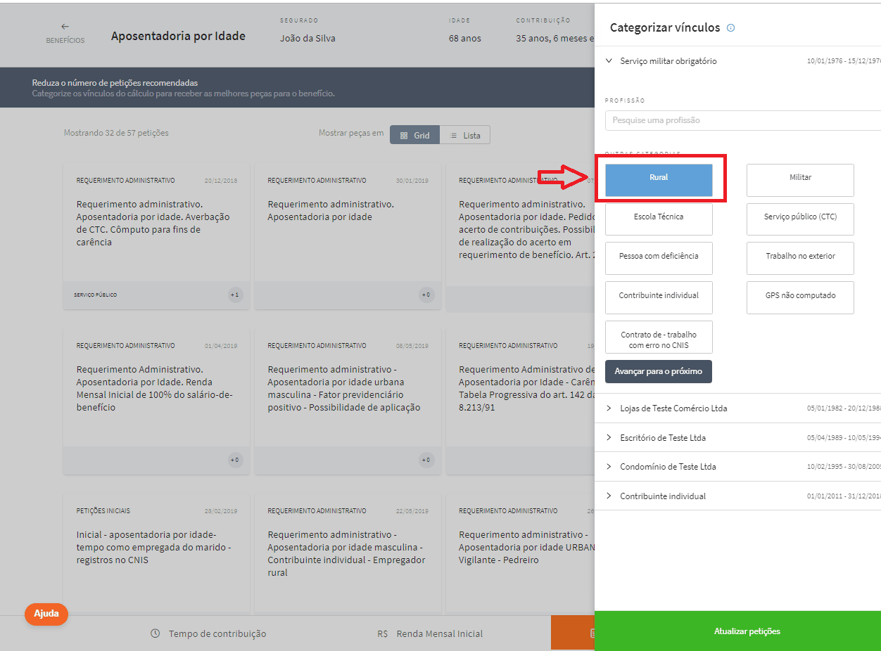 Como bem sabemos, a aposentadoria por idade híbrida nada mais é do que uma aposentadoria por idade com períodos urbanos e rurais. Por este motivo, basta que o Advogado Previdenciarista ao fazer o cálculo no novo PREV selecione o benefício de aposentadoria por idade, e em seguida selecione o filtro “Rural” quando estiver na aba “Petições para o benefício”:
