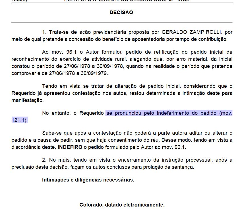 Na espécie, conforme depreende-se dos documentos acostados pelo próprio agravante, verifica-se que o INSS se pronunciou pelo indeferimento do pedido (mov.121.1, ev. 01, OUT10). Logo, acertada a decisão agravada, pois, no intuito de garantir segurança às partes, impossível modificar o pedido sem o consentimento do réu.
