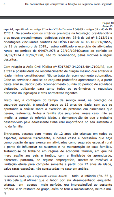 O reconhecimento de atividade laboral antes dos 12 anos foi objeto da Ação Civil Pública nº 5017267-34.2013.4.04.7100/RS, tendo sido autorizado o cômputo de período de trabalho rural realizado antes dos 12 anos de idade, para fins de reconhecimento de tempo de serviço e de contribuição pelo exercício das atividades descritas no art. 11 da Lei 8.213/91, sem a fixação de requisito etário. Com efeito, admite-se, excepcionalmente, o reconhecimento de atividade rural anterior aos 12 anos de idade, desde que caracterizado o efetivo exercício de labor rural.