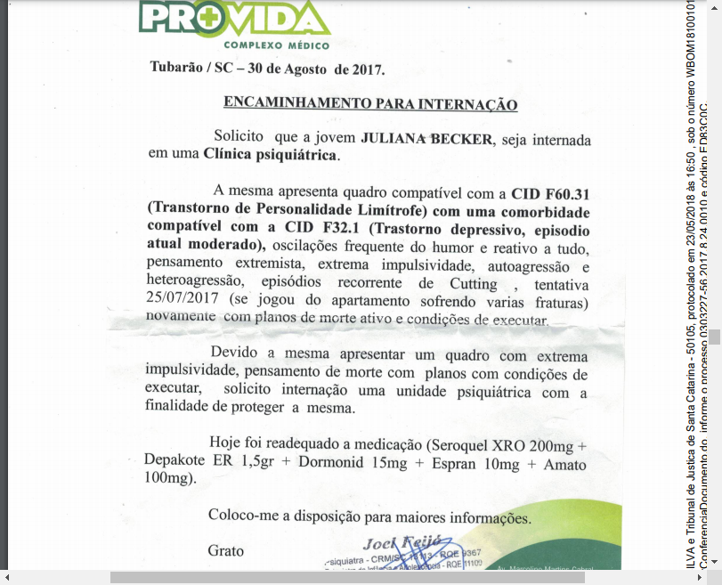 d) atestado médico, datado em 31/05/2017, relatando que a autora está em tratamento psiquiátrico por transtorno de personalidade com instabilidade, exibindo um quadro grave e sem resposta terapeutica satisfatória (e.2.4).