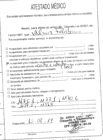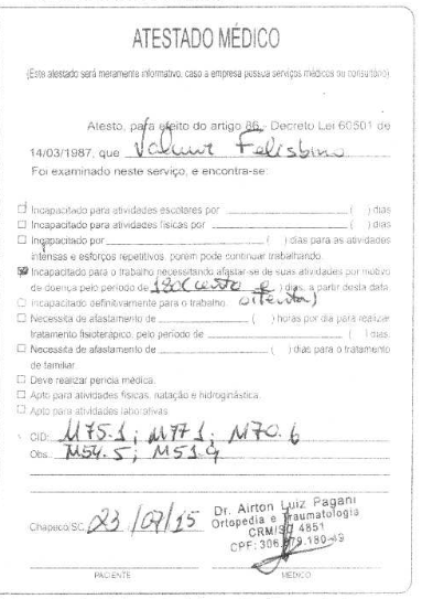A parte autora (agricultor e 43 anos de idade atualmente) objetiva a concessão/restabelecimento de benefício por incapacidade desde 08-08-2014 (DCB), decorrente de doenças ortopédicas e traumatologicas (transtorno não especificado de disco intervertebral, bursite trocantérica, epicondilite lateral, síndrome do manguito rotador, dor lombar baixa e tendinite glútea: CID M51.9, M70.6, M77.1, M75.1, M54.5 e M76.0), comprovadas pela seguinte documentação clínica: