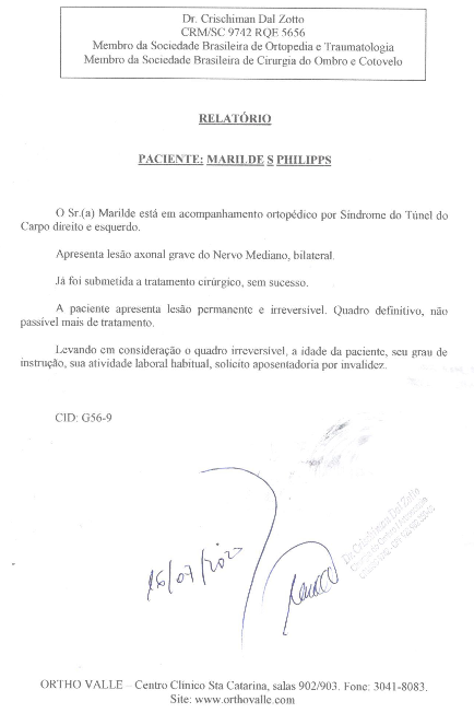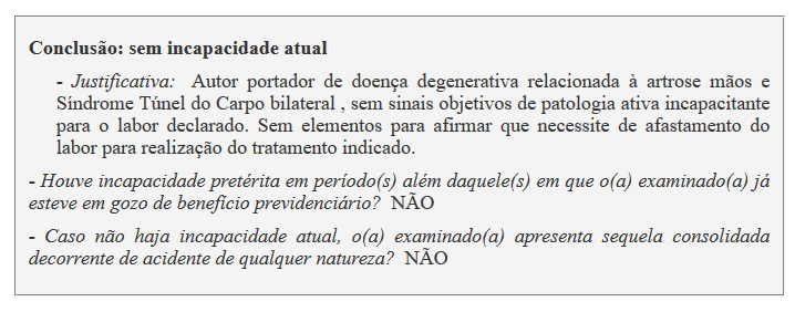 - Justificativa: Autor portador de doença degenerativa relacionada à artrose mãos e Síndrome Túnel do Carpo bilateral , sem sinais objetivos de patologia ativa incapacitante para o labor declarado. Sem elementos para afirmar que necessite de afastamento do labor para realização do tratamento indicado.