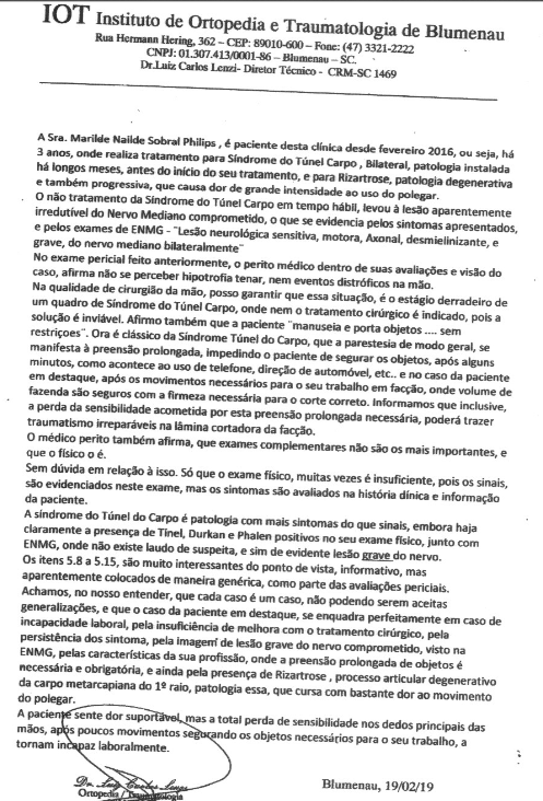 Alega que, embora o exame físico seja um procedimento particular do Perito Judicial, é inconteste que os documentos médicos evidenciaram alterações importantes e incapacidade laborativa, ao contrário do que foi asseverado pelo perito. O próprio perito em sua conclusão, admitiu a existência da STC associado à artrose das mãos, porém o Perito pareceu desconhecer a atividade laboral da recorrente e, mesmo tendo em mãos três exames consecutivos que demonstravam sem nenhum equívoco a Mononeuropatia sensitiva e motora axonal grave do Nervo Mediano Bilateral, deixou de considerar. Essa lesão é permanente e irreversível, ainda que tenha sido empregado todo tratamento possível.