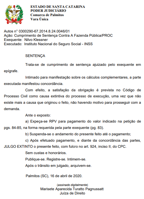 Trata-se de cumprimento de sentença referente ao processo nº 0300290-67.2014.8.24.0046 (