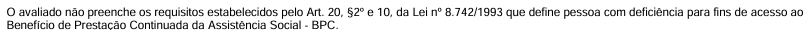 Em vista disso, foi editada a Portaria Conjunta MDS/INSS nº 2/2015 a qual, ao dispor sobre critérios, procedimentos e instrumentos para a avaliação social e médica da pessoa com deficiência para acesso ao Benefício de Prestação Continuada, definiu em seu art. 8º as seguintes hipóteses nas quais não se reconheceria a qualificação do impedimento de longo prazo e, com isso, indeferir-se-ia o requerimento: