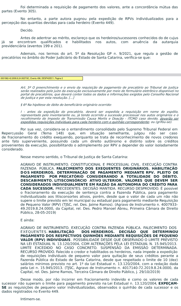 , p. 174-176):Sustenta, em síntese, que, embora o valor que toca a cada um dos herdeiros na presente execução corresponda a quantia inferior a 60 salários-mínimos, o total do crédito do espólio atinge montante superior ao aludido patamar, excedendo o limite para expedição de RPV.