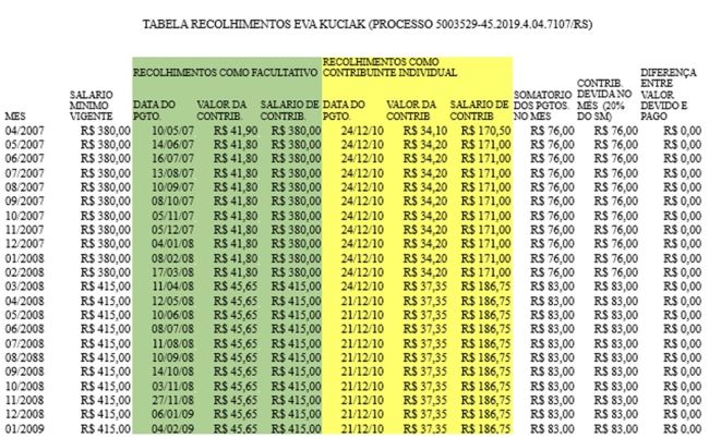 Não obstante a omissão do INSS em fornecer o cálculo solicitado, consulta ao CNIS da parte autora, feita por esta relatoria, demonstrou que somando-se as contribuições inicialmente vertidas como contribuinte facultativo (ev1, OUT3, p. 09/38) às posteriores, realizadas em atraso de forma consolidada, na condição de contribuinte individual (ev1, OUT3, p. 40/43), a autora recolheu o equivalente a 20% do salário mínimo em cada uma das competências compreendidas entre 04/2007 a 10/2010, como se vê a seguir: